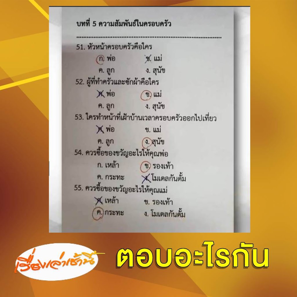 โลกออนไลน์แชร์ภาพข้อสอบของนักเรียน เรื่องความสัมพันธ์ในครอบครัว โดยมีเด็กนักเรียนเลือกคำตอบที่มาจากชีวิตจริงในครอบครัว มากกว่าบทเรียนที่อาจารย์ได้สอนภายในห้องเรียน ก่อนจะมีการเฉลยซึ่งผิดหมดทั้ง 5 ข้อ โดยคำถามดังกล่าวได้แก่